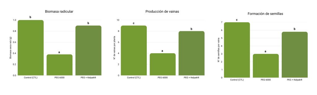 El tratamiento con Kelpak® aplicado via foliar ayudó eficazmente a las plantas a contrarrestar los efectos perjudiciales del estrés por sequía inducido por polietilenglicol (PEG 6000) durante la fase reproductiva de las plantas de frijol.