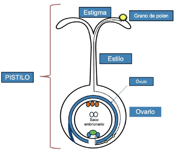 Figura 1. Esquema del pistilo y germinación del grano de polen.