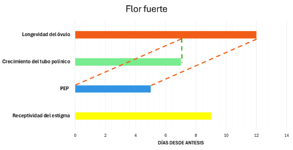 En manzano, se han documentado receptividades de estigma de 6–9 días y tiempos de crecimiento del tubo de 5–7 días, mientras que la longevidad del óvulo declina hacia los 8–10 días, acotando el PEP a ventanas cortas (Roeder et al., 2021).