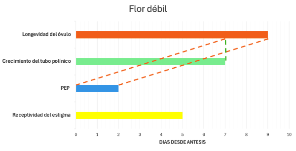 En manzano, se han documentado receptividades de estigma de 6–9 días y tiempos de crecimiento del tubo de 5–7 días, mientras que la longevidad del óvulo declina hacia los 8–10 días, acotando el PEP a ventanas cortas (Roeder et al., 2021).