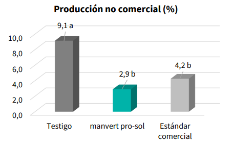 Respecto a la producción comercial, con la aplicación de manvert pro-sol aumentó hasta en un 6,8% respecto al testigo y en un 7,4% respecto al estándar comercial. Un aspecto que la compañía destaca es la disminución de la producción no comercial, con reducciones de hasta un 74% respecto al testigo y del 72% respecto al estándar comercial.